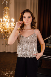 Брюки прямые, на поясе с резинкой. По переду функциональные карманы в швах.