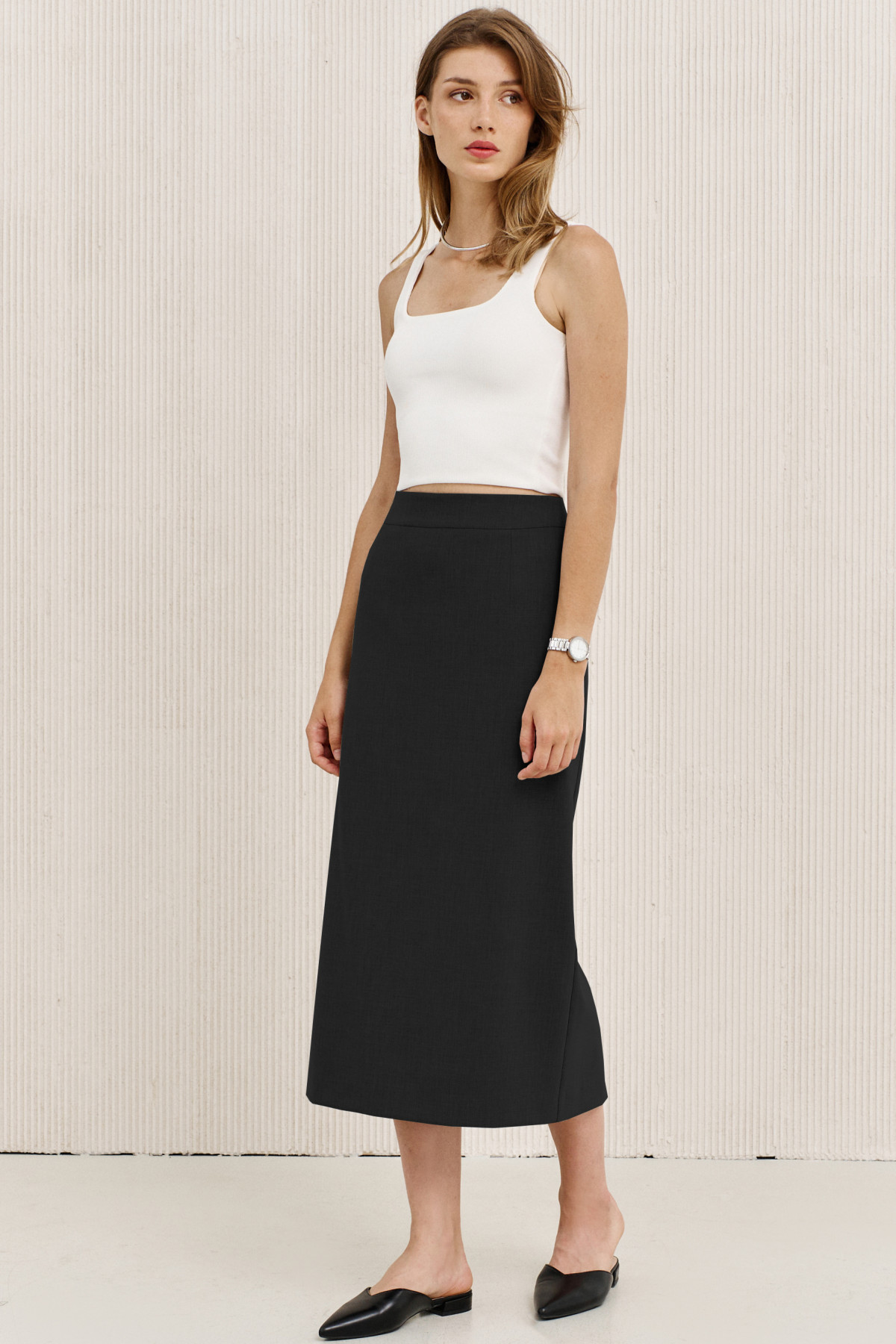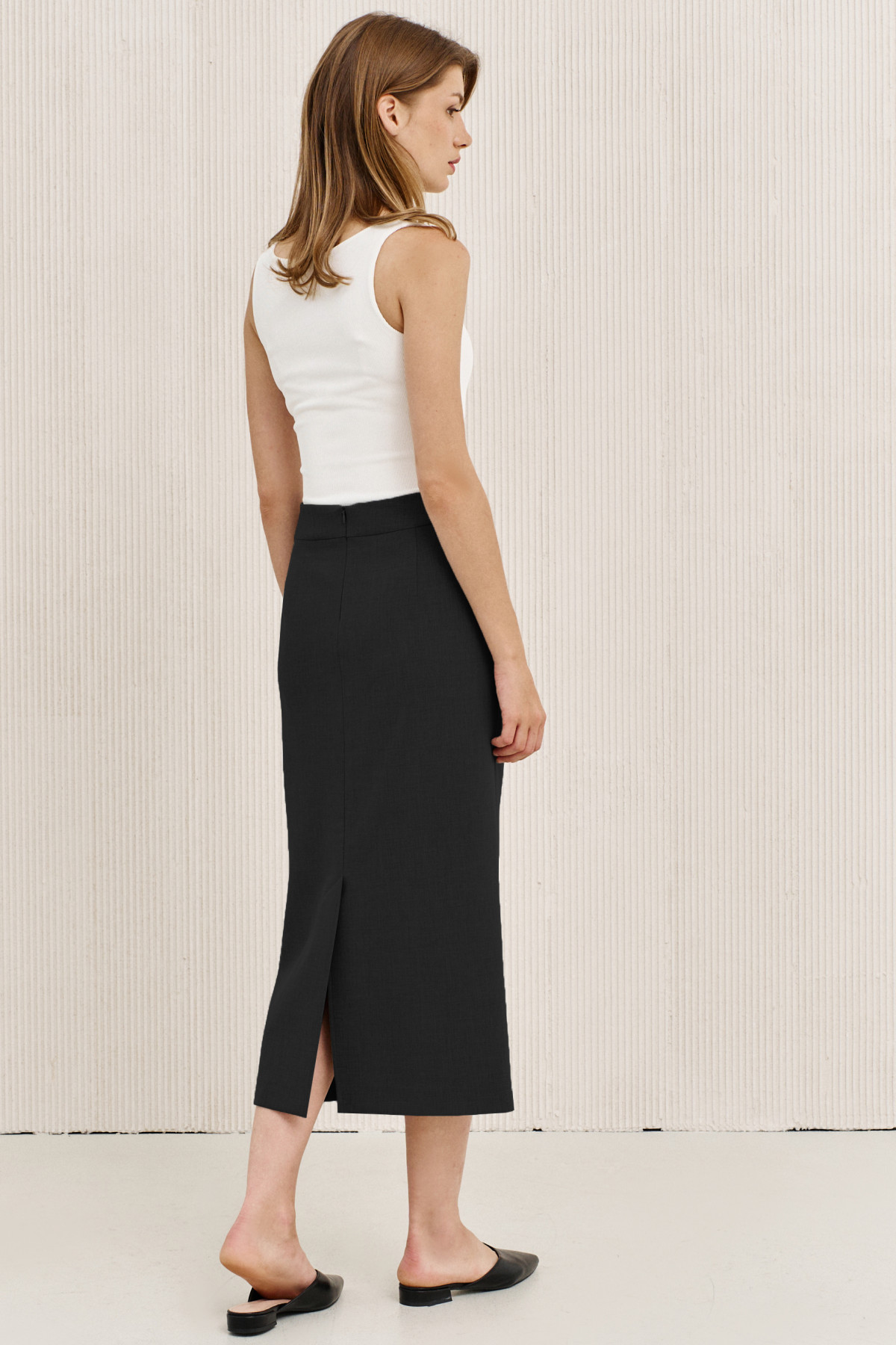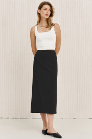 Юбка прямого силуэта длиной миди на подкладке. По заднему полотнищу средний шов и шлица. Юбка на притачном фигурном поясе. Застежка на потайную тесьму-молнию в среднем шве заднего полотнища юбки.