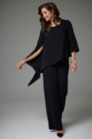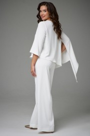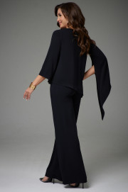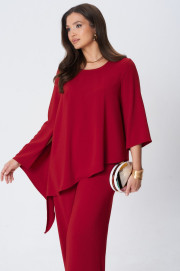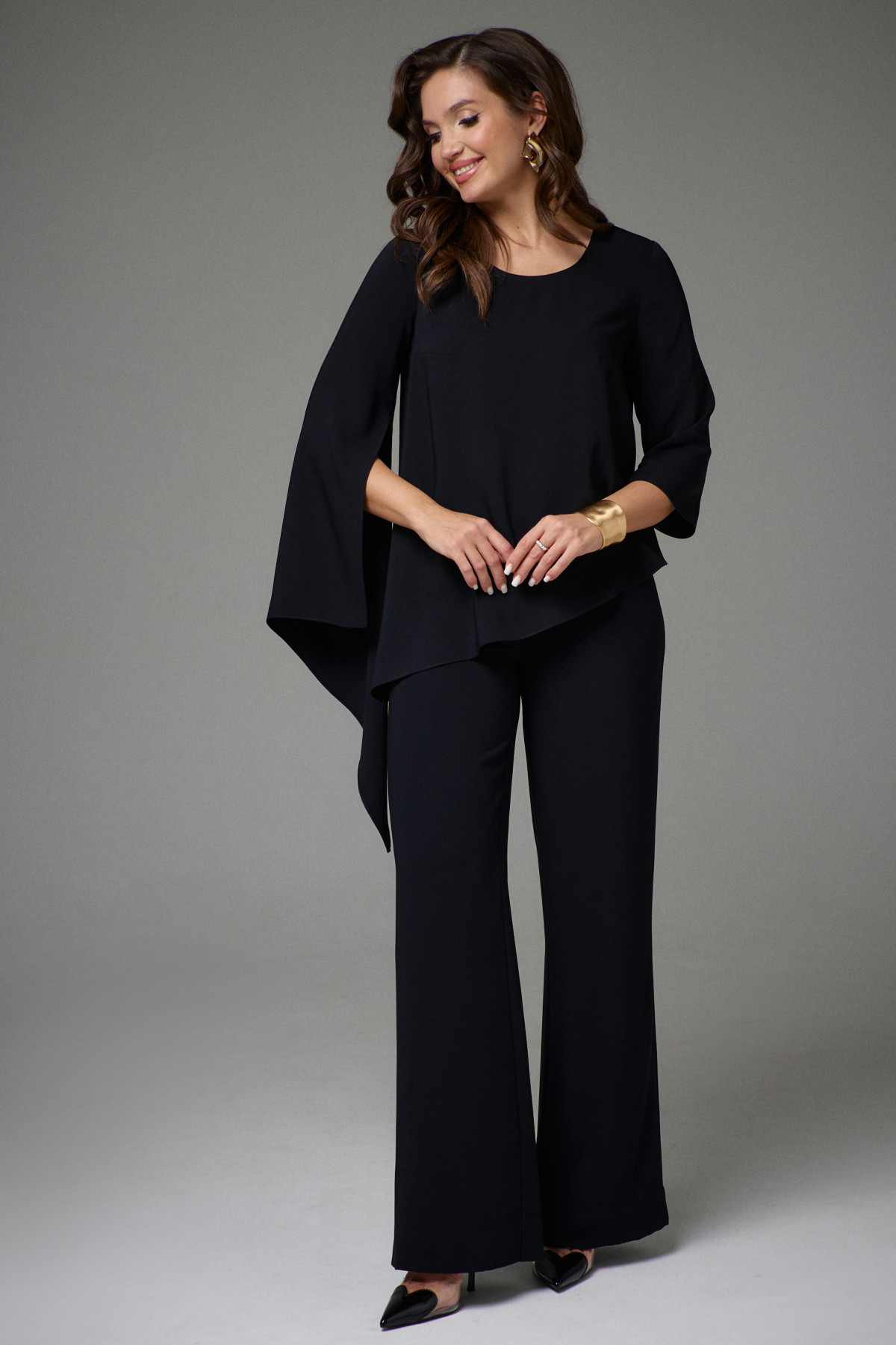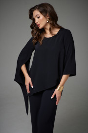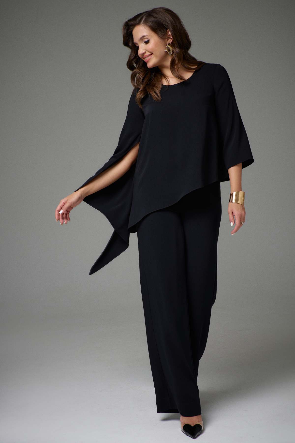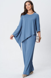 Комплект двухпредметный. Состоит из туники свободного силуэта и прямых брюк. Туника с асимметричным низом. Рукава одношовные, левый рукав длиной ниже линии локтя, правый рукав длинный с асимметричной линией низа и разрезом. Вырез горловины круглый. Брюки на поясе с резинкой