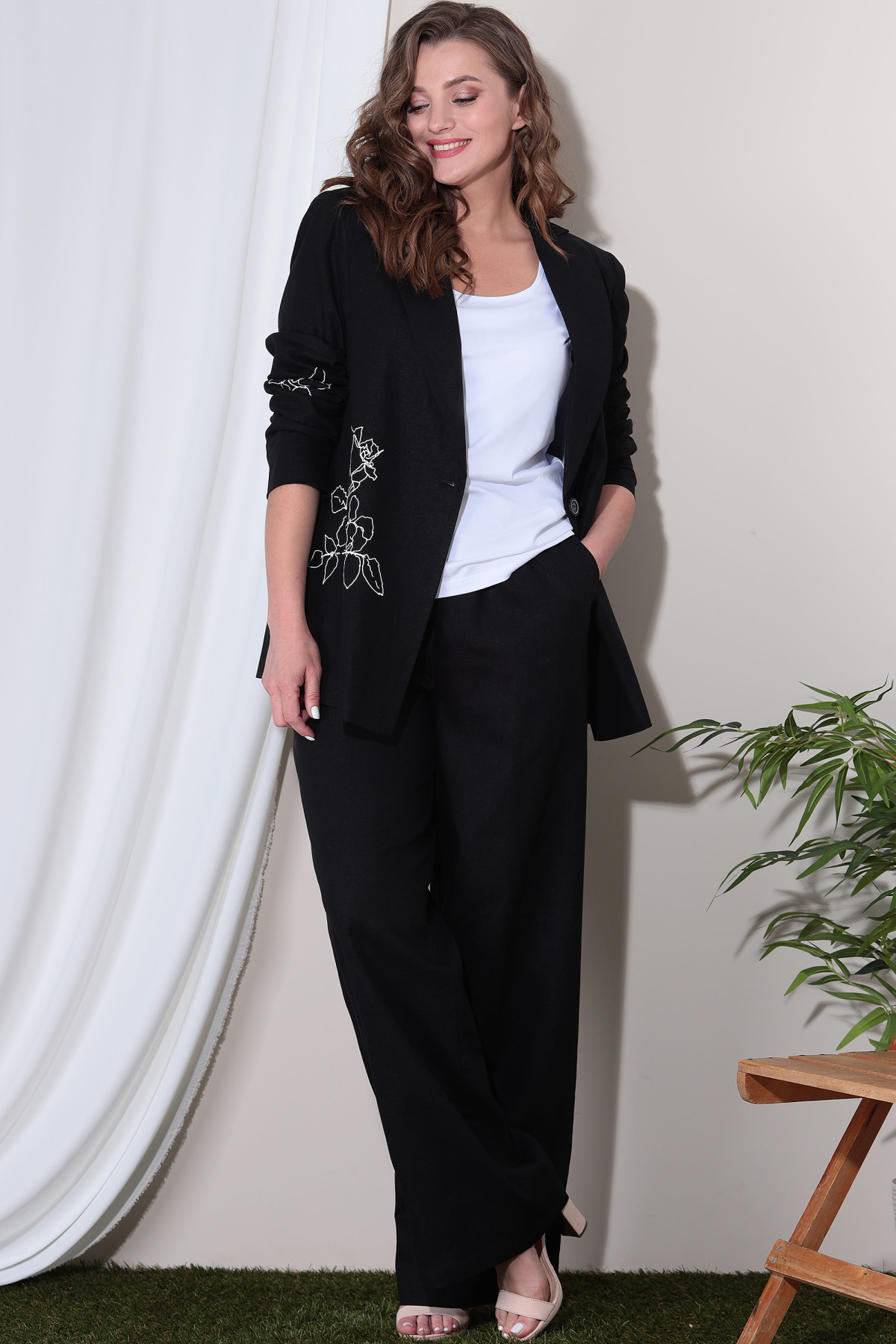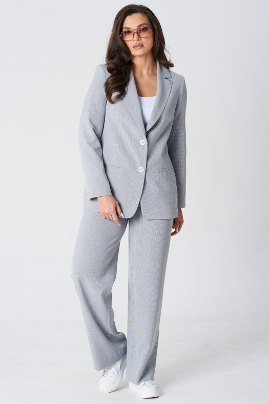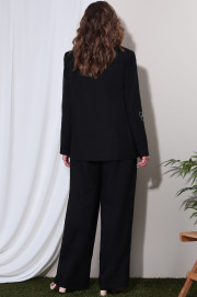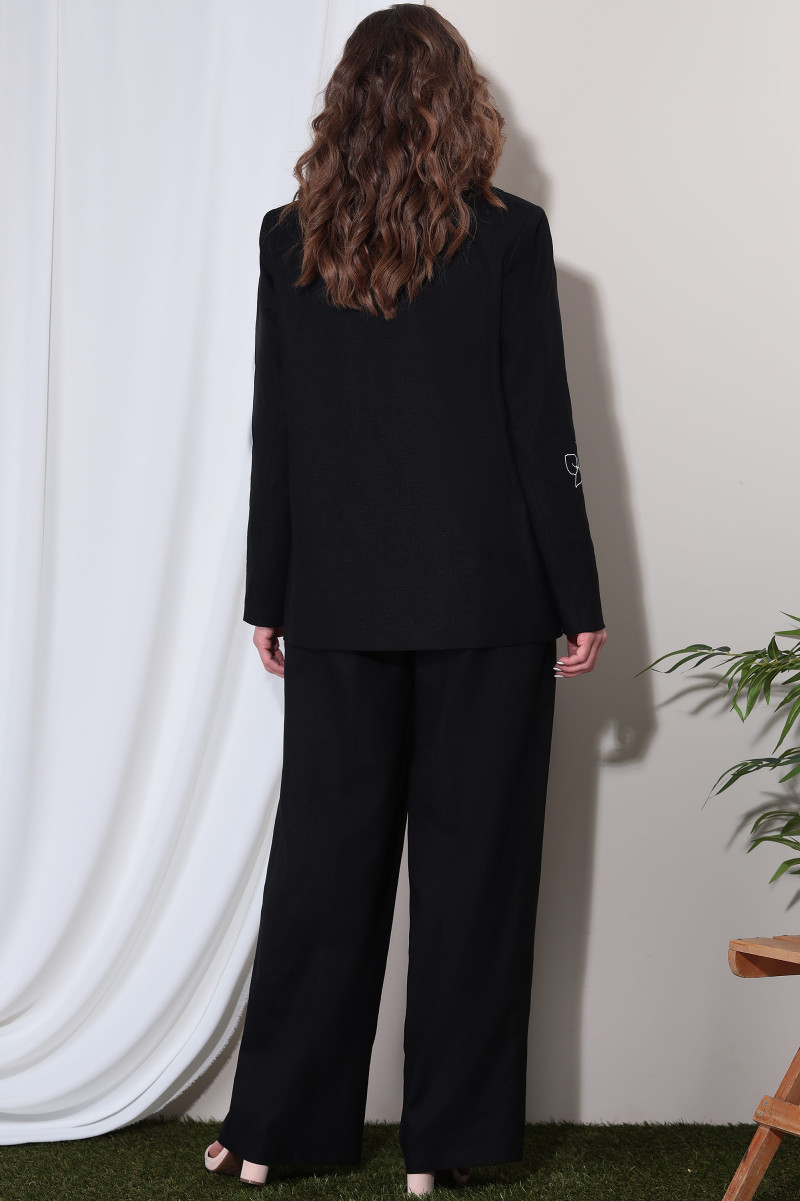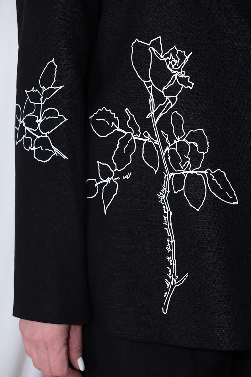 Комплект женский состоящий из жакета и брюк. Жакет прямого силуэта на подкладке. Жакет с отрезным бочком. Воротник пиджачного типа. Застежка центральная бортовая застегивающаяся на 1 петлю и пуговицу. Рукава длинные втачные. По правой части переда и правому рукаву декоративный принт "роза".