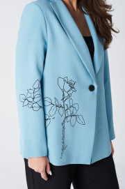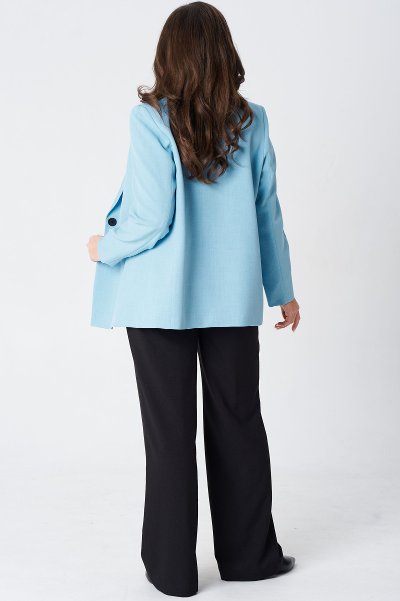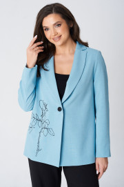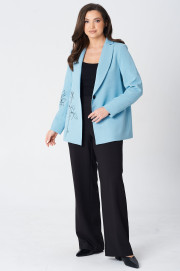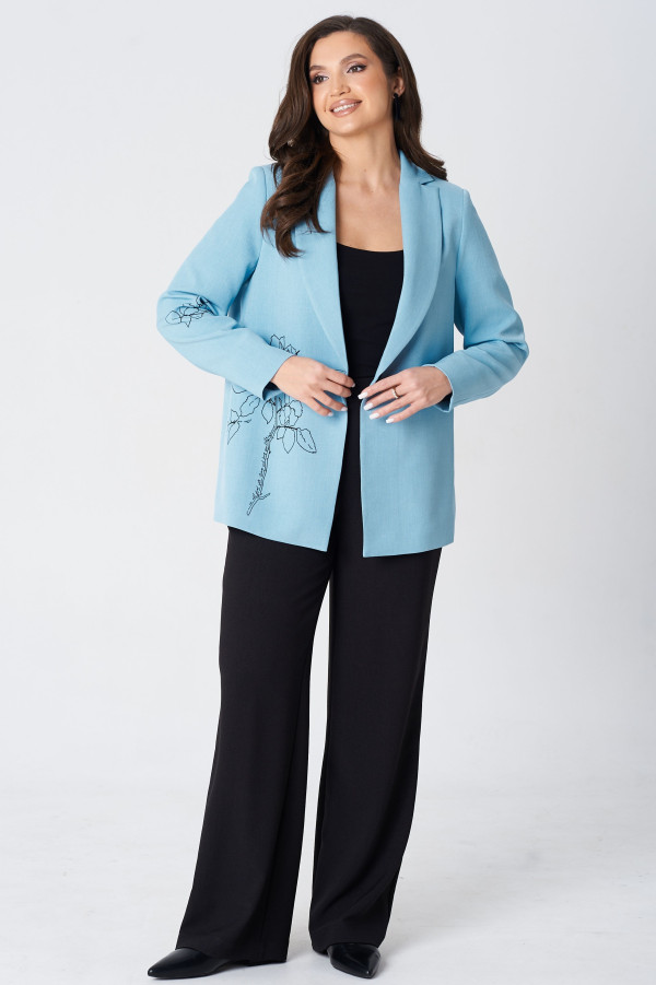 Комплект женский состоящий из жакета и брюк. Жакет прямого силуэта на подкладке. Жакет с отрезным бочком. Воротник пиджачного типа. Застежка центральная бортовая застегивающаяся на 1 петлю и пуговицу. Рукава длинные втачные. По правой части переда и правому рукаву декоративный принт "роза".