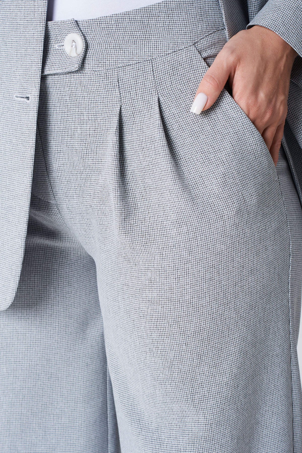 Брюки прямые на притачном поясе застегивающиеся на петлю и пуговицу. По переду расположены функциональные боковые карманы-хулиганы и односторонние складки. Застежка на тесьму-молнию.