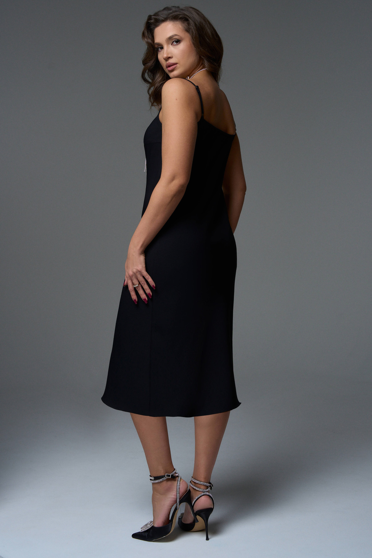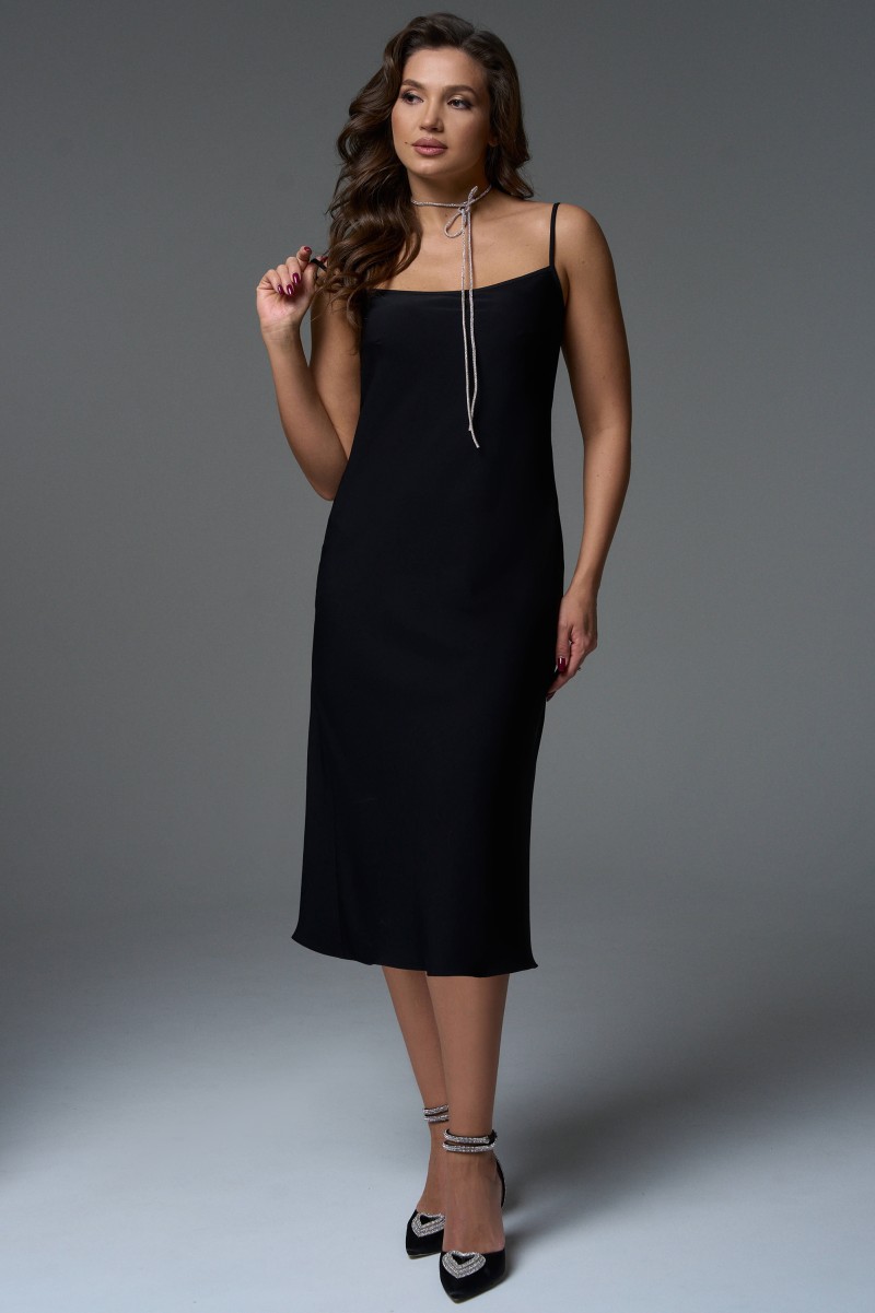 Платье-комбинация, прямого силуэта с регулируемыми бретелями, длиной миди. Благодаря косому крою платье мягко подчеркнут изгибы фигуры, при этом не сковывая движения.