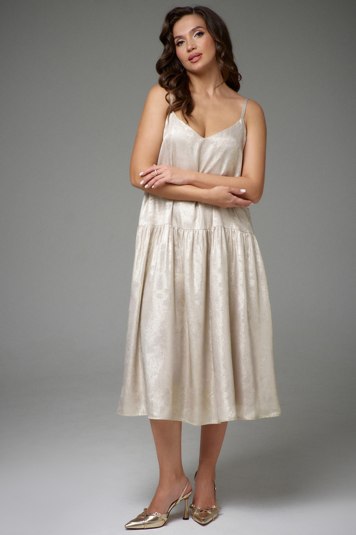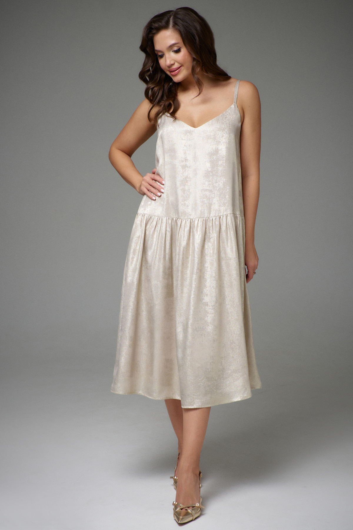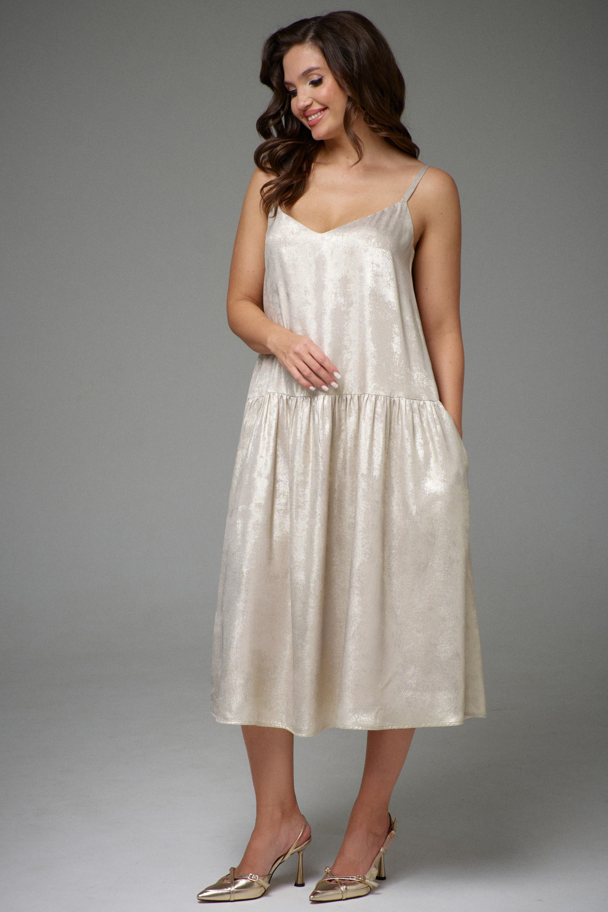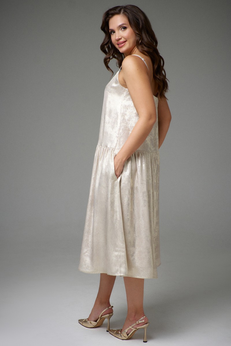 Платье A-образного силуэта, на эластичной подкладке, с регулируемыми бретелями. В области бёдер горизонтальный подрез, нижняя часть со сборкой. В боковых швах функциональные карманы. Платье выполнено из приятной, лёгкой, плательной ткани с эффектом мокрого шёлка.