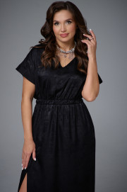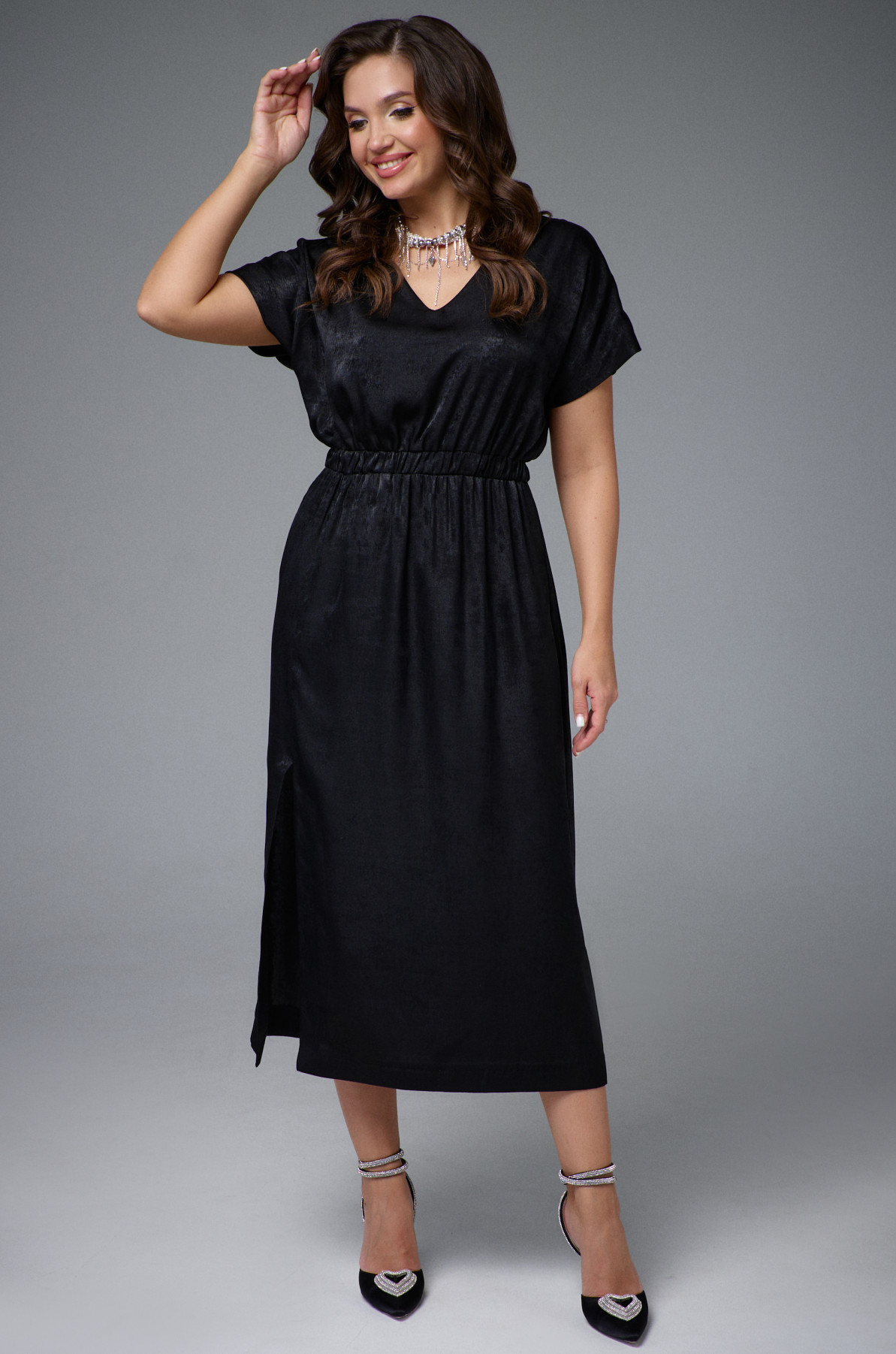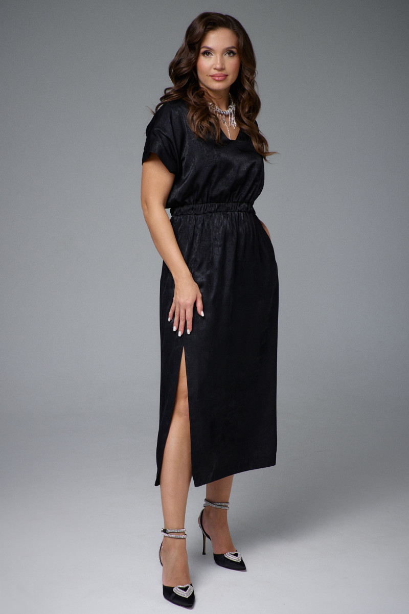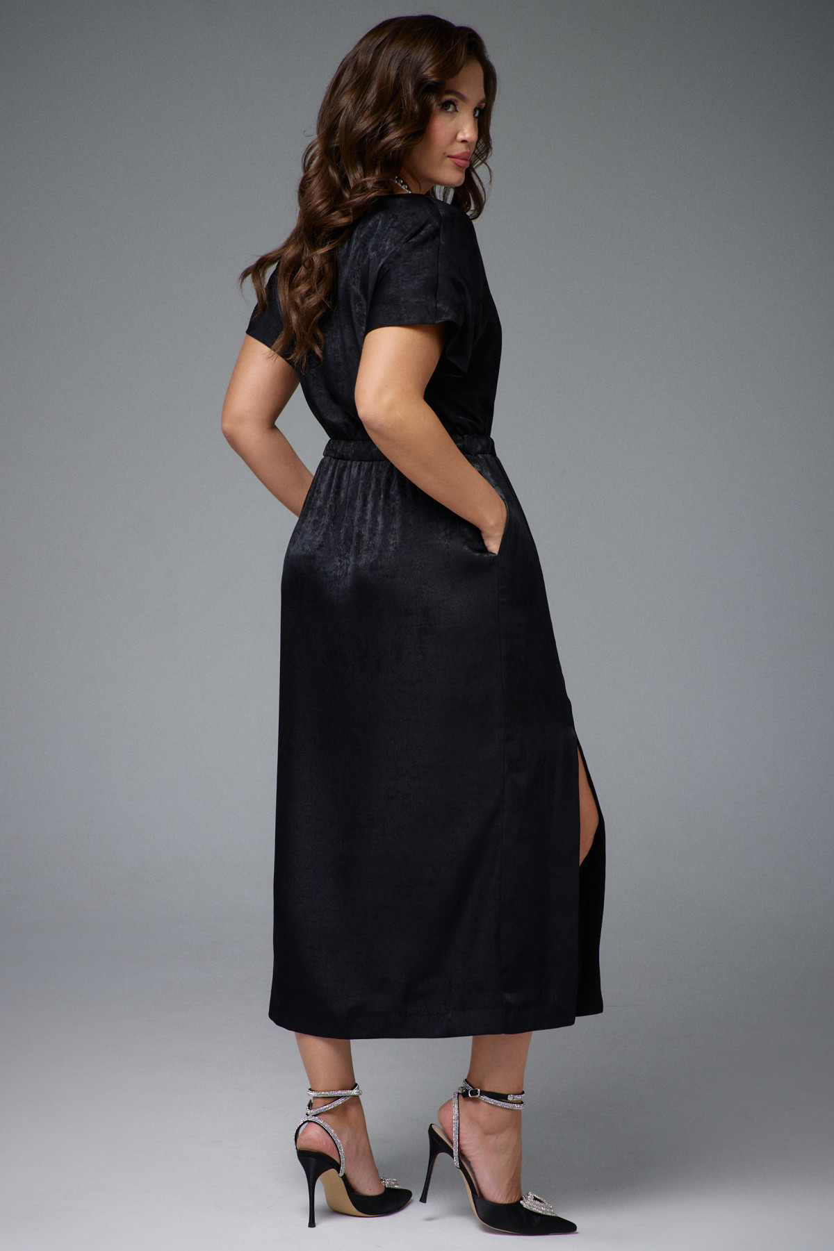Платье женское на подкладке,отрезное по линии талии с резинкой. Лиф платья со спущенной линией плеча и V-образным вырезом горловины. По переднему полотнищу юбки разрез и функциональные карманы в боковых швах.
