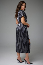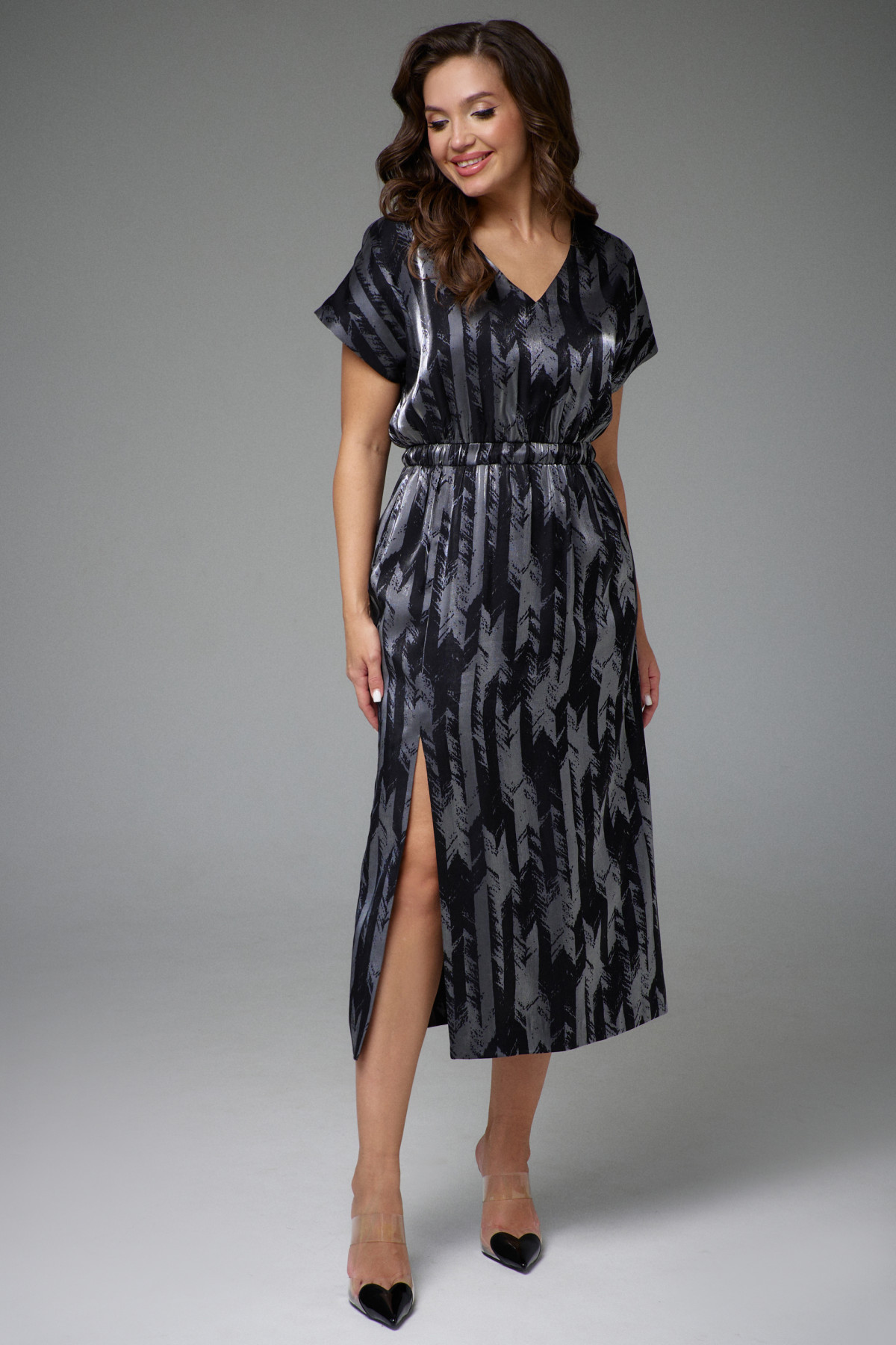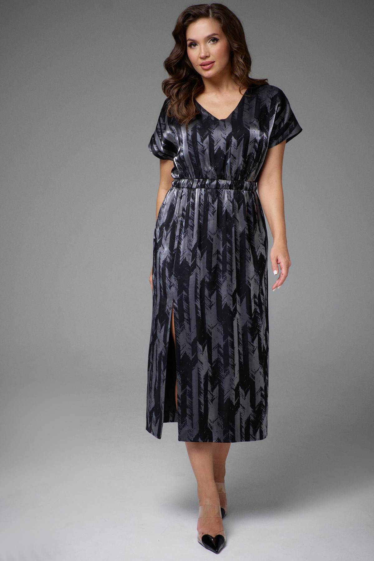 Платье женское на подкладке,отрезное по линии талии с резинкой. Лиф платья со спущенной линией плеча и V-образным вырезом горловины. По переднему полотнищу юбки разрез и функциональные карманы в боковых швах.