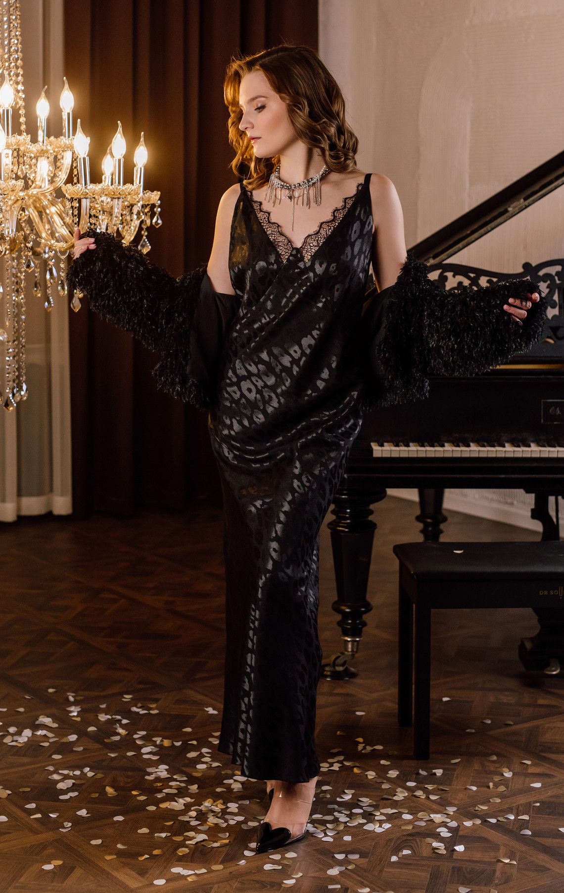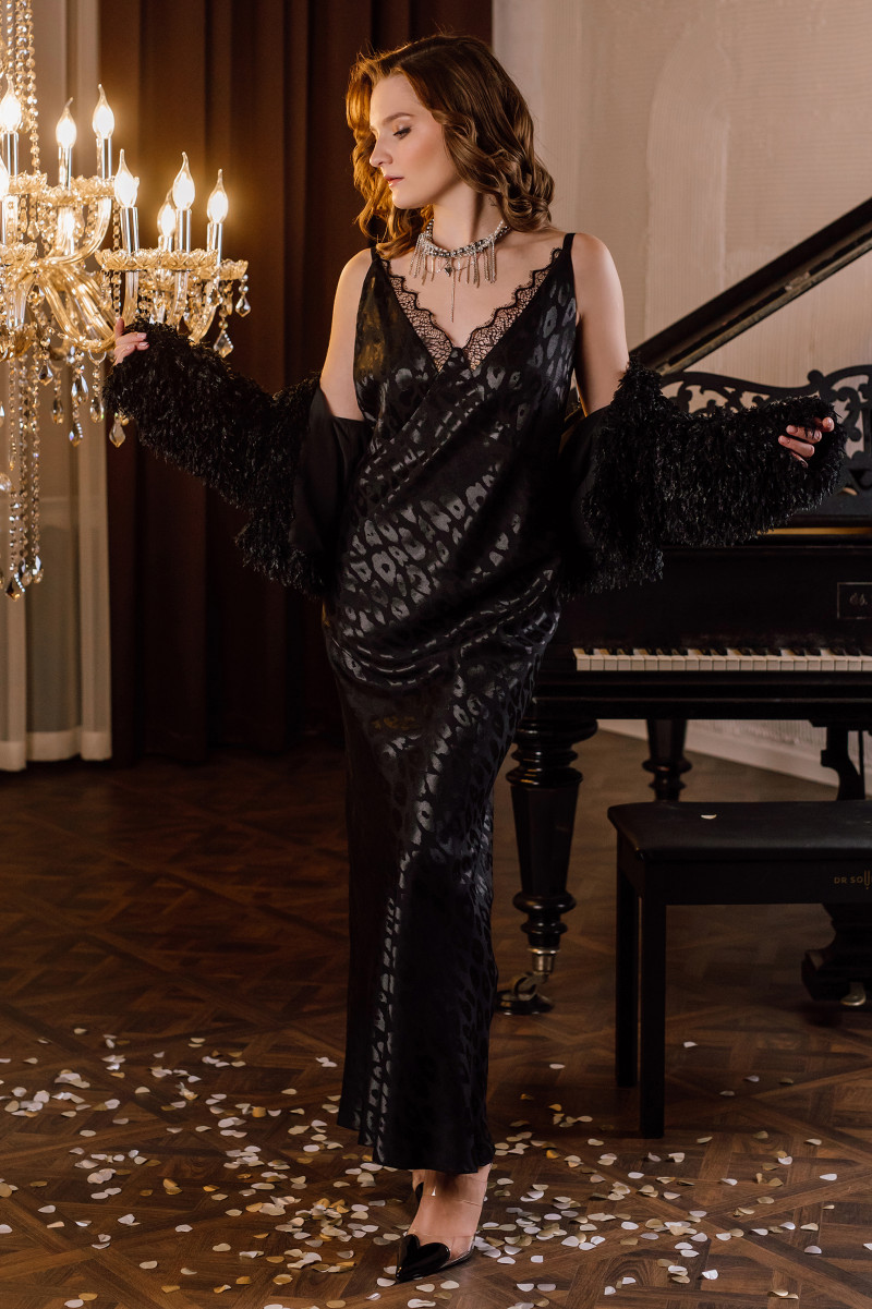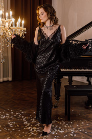 Длинное платье- комбинация, приталенного силуэта на регулируемых бретелях. Перед с фигурными подрезами подчеркивающими линию груди. Отделкой является французское кружево вдоль линии горловины. Платье косого кроя, на мягкой эластичной на подкладке.