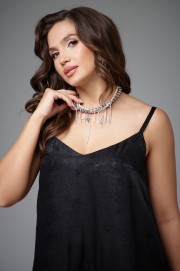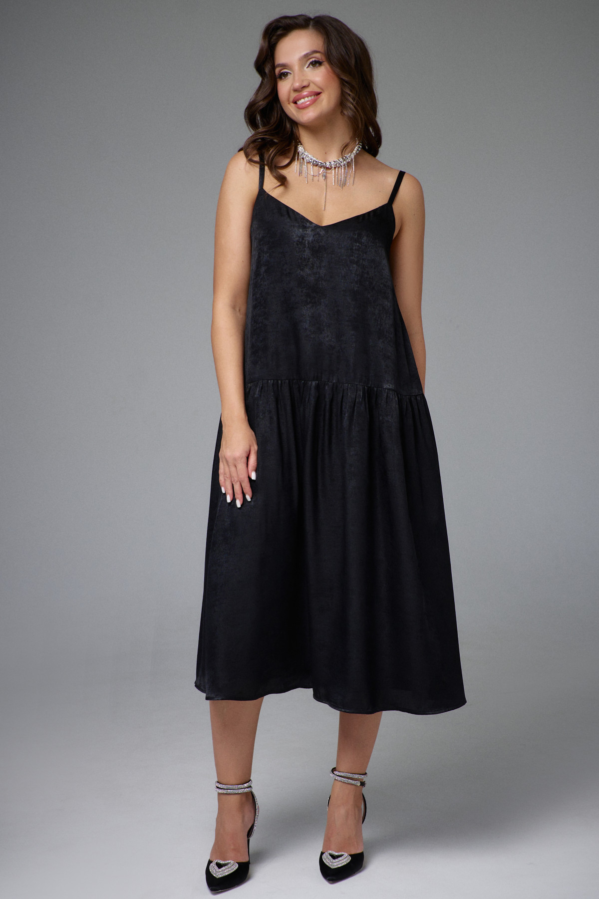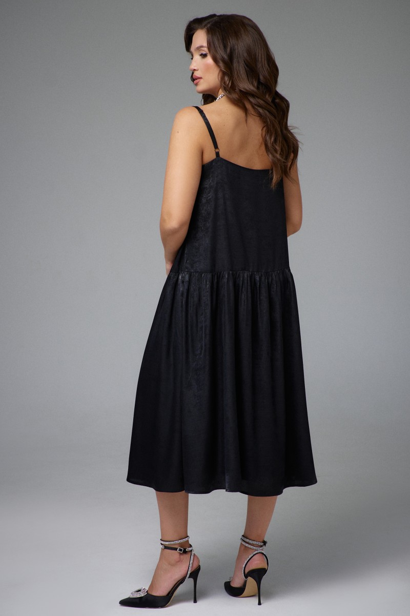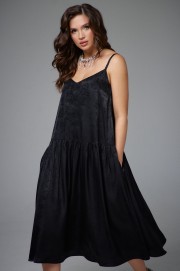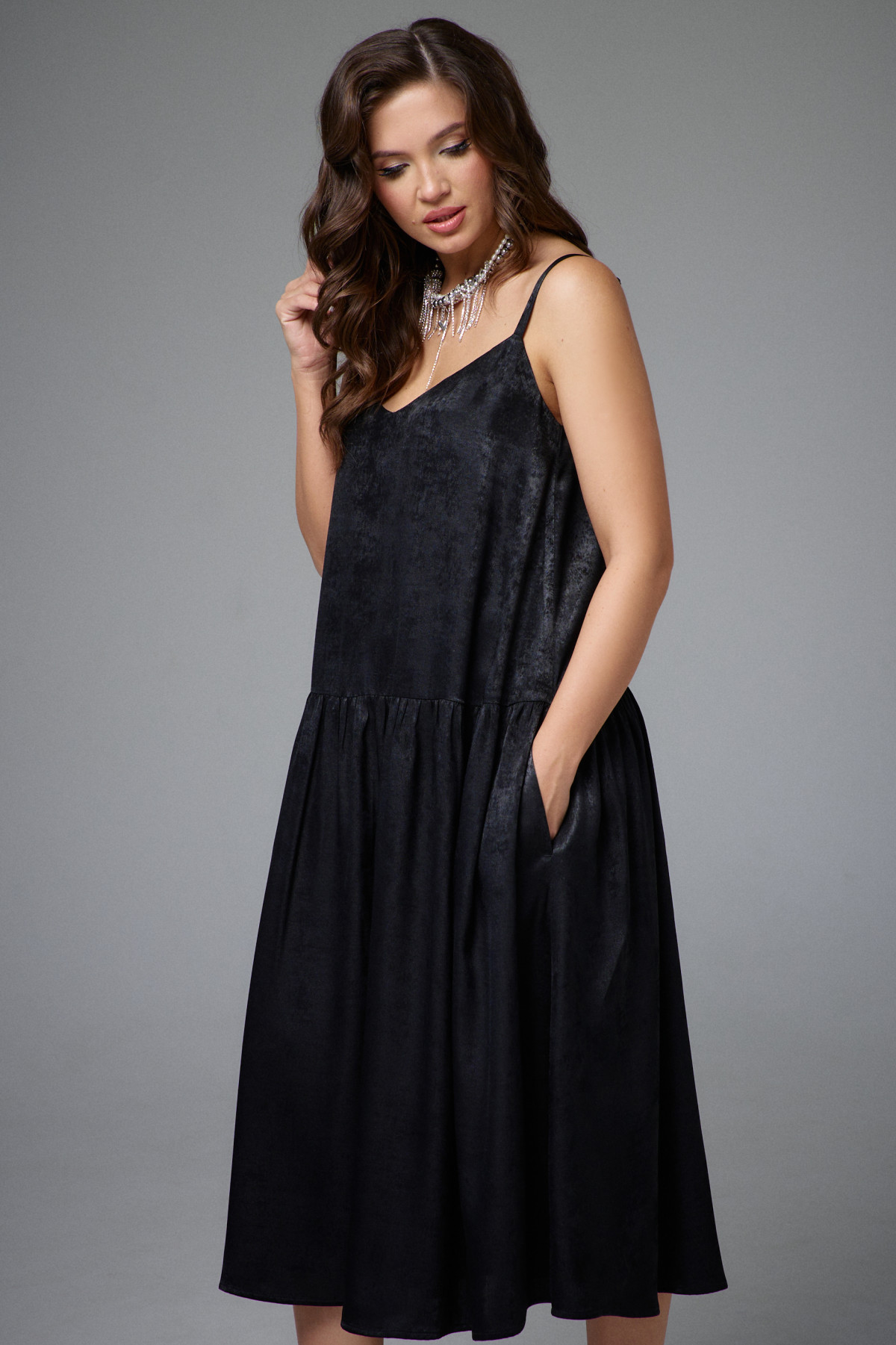 Платье A-образного силуэта, на эластичной подкладке, с регулируемыми бретелями. В области бёдер горизонтальный подрез, нижняя часть со сборкой. В боковых швах функциональные карманы. Платье выполнено из приятной, лёгкой, плательной ткани с эффектом мокрого шёлка.