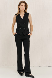 Жилет женский, укороченный, приталенного силуэта. По переду вертикальные рельефы из проймы, прорезные функциональные карманы с клапаном. Спинка со средним швом и талиевыми вытачками. Вырез горловины V-образный. Застежка двубортная на 4 пуговицы и петли. Низ борта фигурной формы.