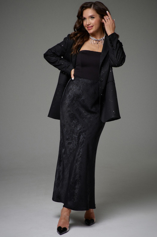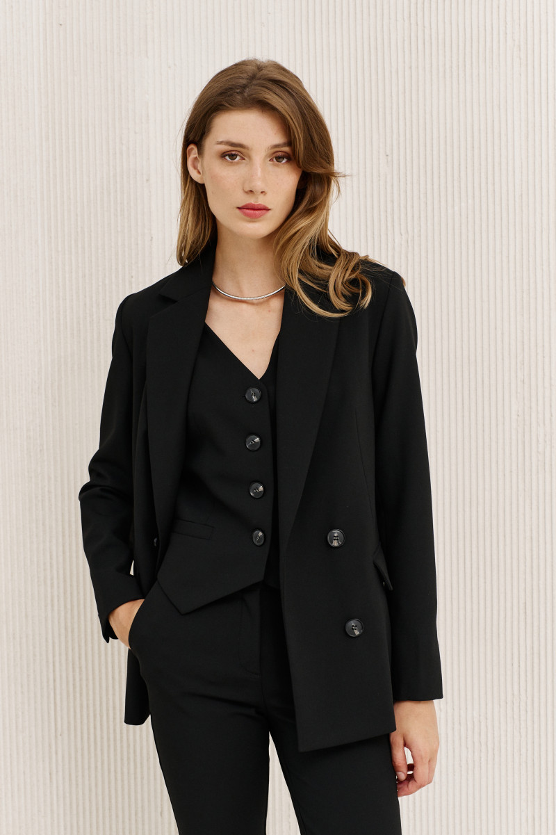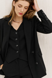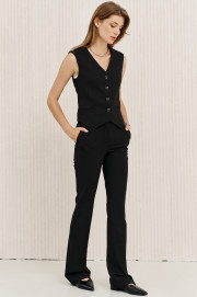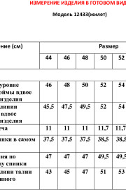 Жилет женский, укороченный, полуприлегающего силуэта. Спинка со средним швом и вертикальными рельефами.По переду нагрудная вытачка из подреза, прорезные карманы обманки с листочкой. Вырез горловины V-образный. Застежка на 4 пуговицы и петли. Низ борта фигурной формы.