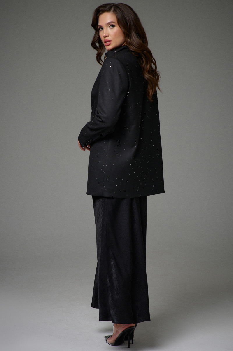 Жакет прямого силуэта на подкладке. Перед с декоративными вытачками и функциональными карманами в рамку. Воротник пиджачного типа. Застежка центральная бортовая застегивающаяся на 2 декоративных пуговицы, край борта закруглен. Рукав длинный втачной со шлицей и с 4-мя декоративными пуговицами.