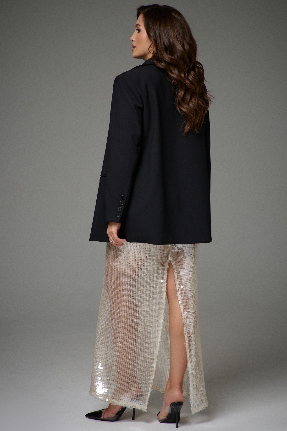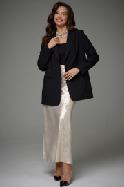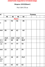 Жакет прямого силуэта на подкладке. Перед с декоративными вытачками и функциональными карманами в рамку. Воротник пиджачного типа. Застежка центральная бортовая застегивающаяся на 2 декоративных пуговицы, край борта закруглен. Рукав длинный втачной со шлицей и с 4-мя декоративными пуговицами.
