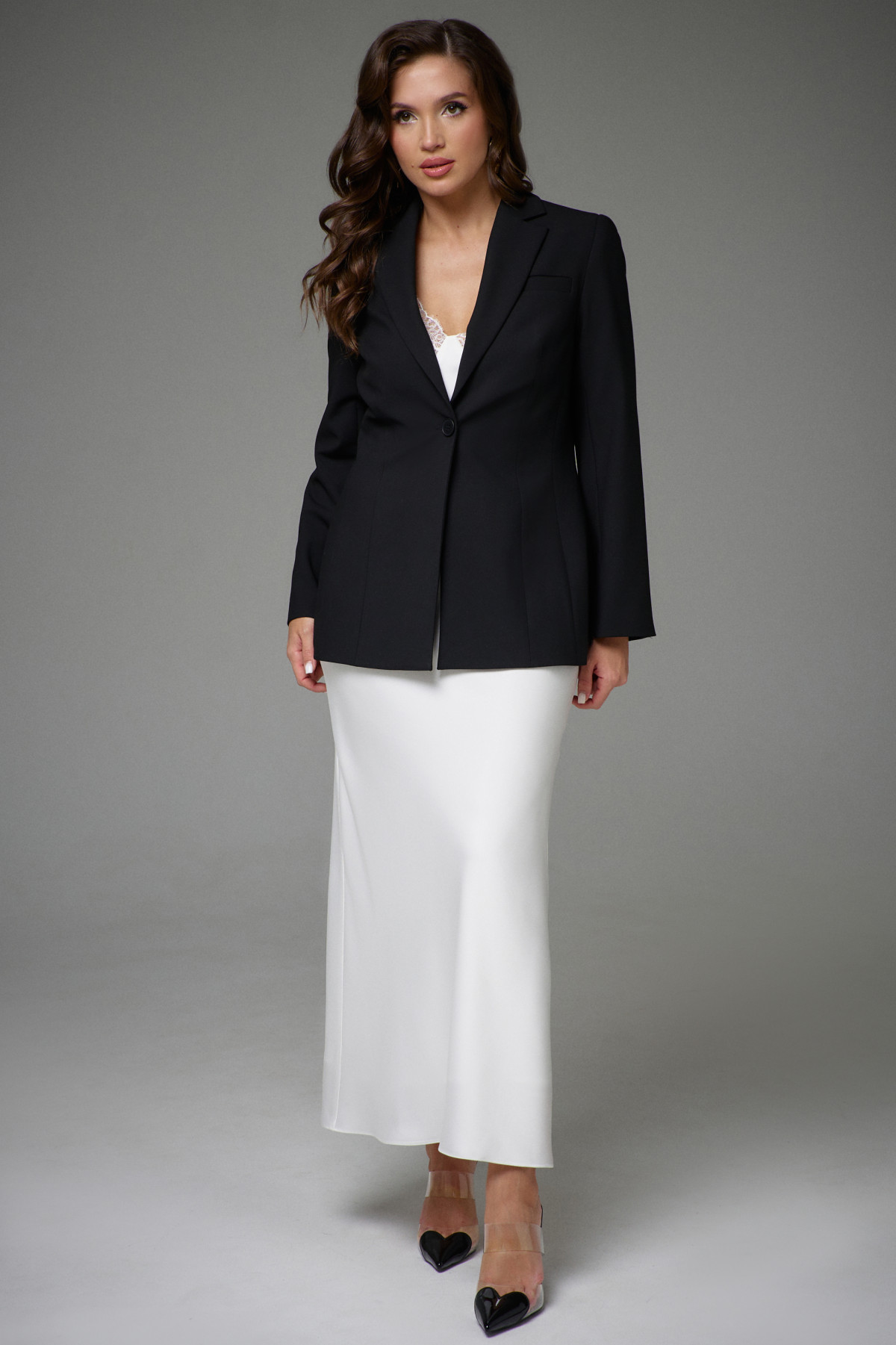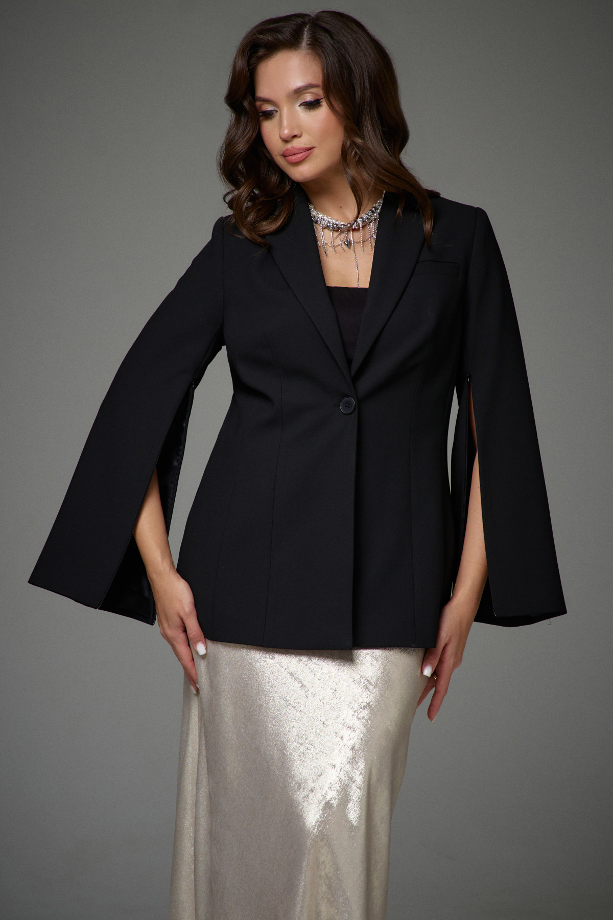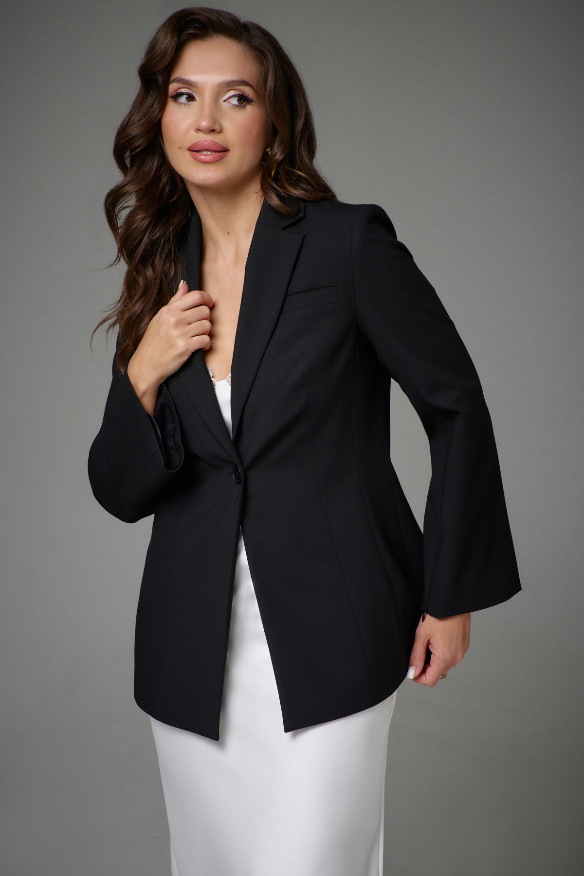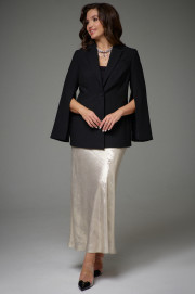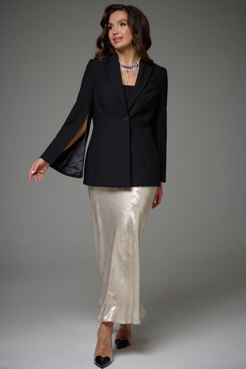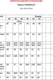 Жакет полуприлегающего силуэта на подкладке. Перед с декоративными вытачками и отрезными бочками. На левой стороне переда функциональный нагрудный карман с листочкой. Спинка со средним швом и талиевыми вытачками. Воротник пиджачного типа. Застежка центральная бортовая застегивающаяся на 1 декоративную пуговицу. Рукав длинный втачной с потайной молнией длиной 30см. Молния в рукаве придает жакету индивидуальность.