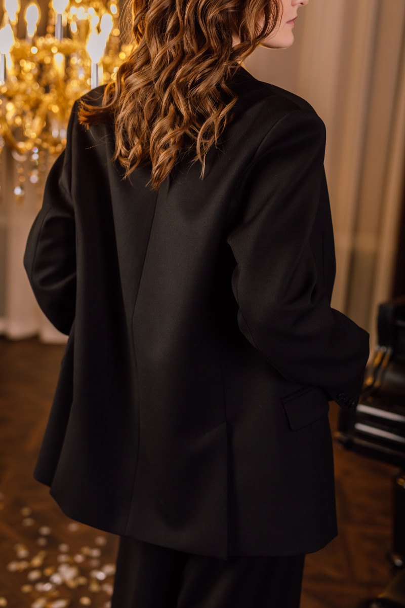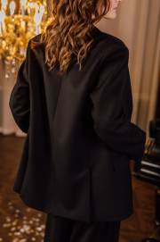 Жакет полуприлегающего силуэта на подкладке. Перед с декоративными вытачками, отрезным бочком, двумя прорезными функциональными карманами с клапаном и нагрудным карманом обманкой с листочкой. Спинка со средним швом и рельефами, в рельефах шлицы. Воротник пиджачного типа. Застежка центрально-бортовая застегивающаяся на 2 декоративных пуговицы и петли. Рукав длинный втачной со шлицей и с 4-мя декоративными пуговицами.