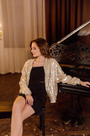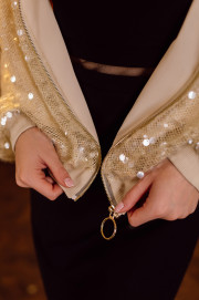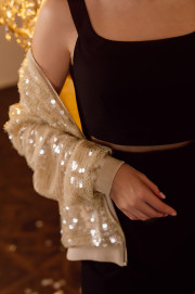 Бомбер на подкоадке, прямого силуэта со спущнной линией плеча. Рукав длинный. Застежка на тесьму-молнию. Низу рукава, изделия и горловина оформлены трикотажным довязом.