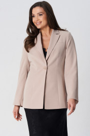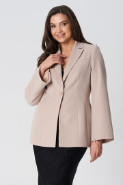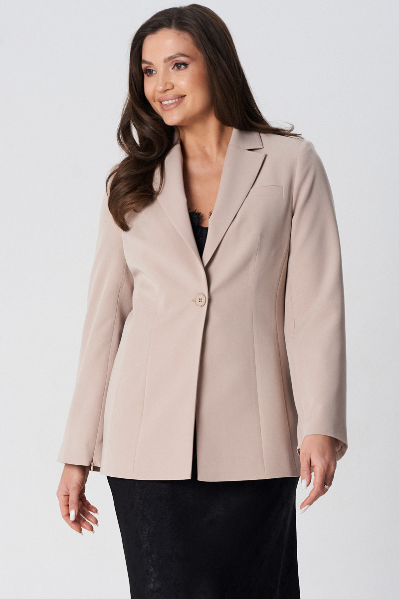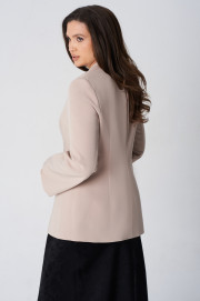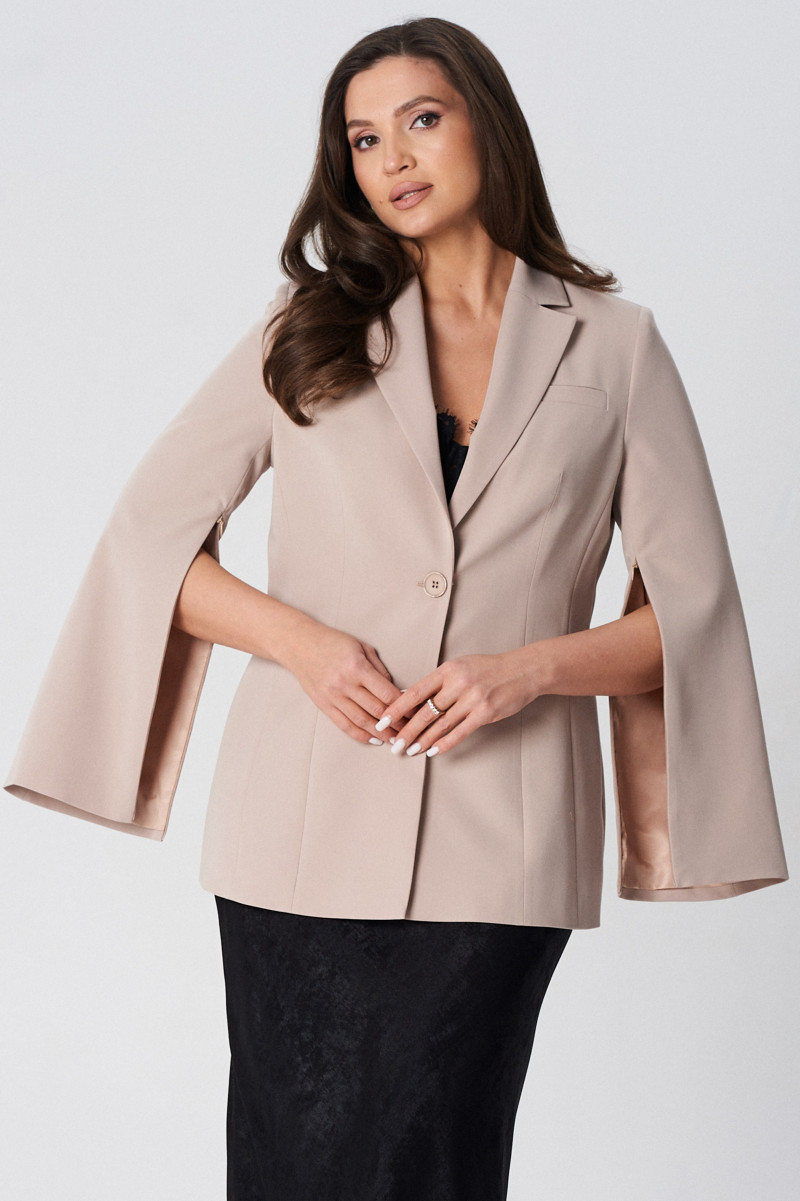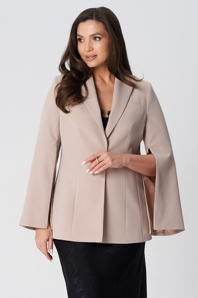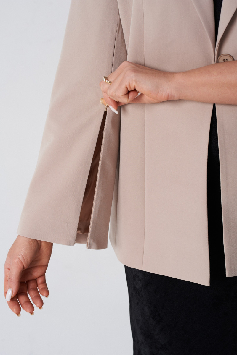Жакет полуприлегающего силуэта на подкладке. Перед с декоративными вытачками и отрезными бочками. На левой стороне переда функциональный нагрудный карман с листочкой. Спинка со средним швом и талиевыми вытачками. Воротник пиджачного типа. Застежка центральная бортовая застегивающаяся на 1 декоративную пуговицу. Рукав длинный втачной с потайной молнией длиной 30 см. Молния в рукаве придает жакету индивидуальность